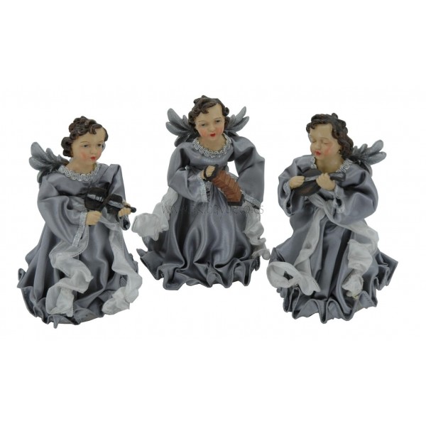 Set de tres ángeles con instrumentos musicales, de poliresina y tela color plata, altura 17 cm