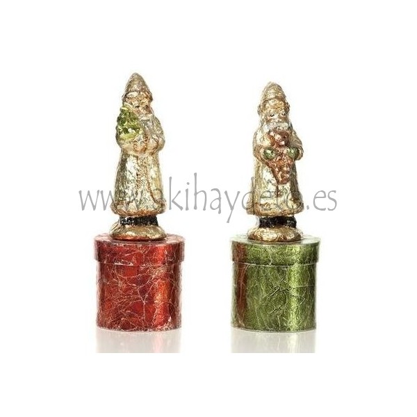 Set de dos Cajas regalo con Papa Noel, de cartón duro metalizado en tonalidades rojo, verde y oro. Medidas 15 x Ø 8 cm.
