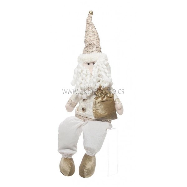 Papá Noel con los píes colgando en textil color blanco y dorado, altura aproximada 80 cm, con cascabel en el borro.