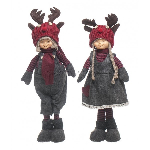 Pareja niño/niña decorativo con gorros de renos en tela, de altura aproximada 34 cm.