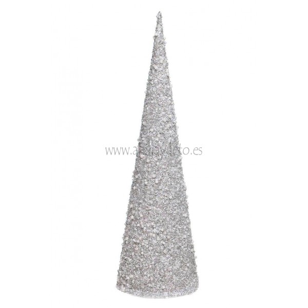 Decoración de Navidad, cono de cartón duro con purpurina plateada y perlas decorativas. Medidas 15x55 cm.