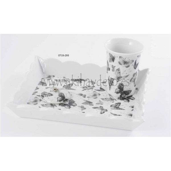 Bandeja rectangular Somo en porcelana tapizada modelo Mariposa Negra, medidas 24x20 cm.