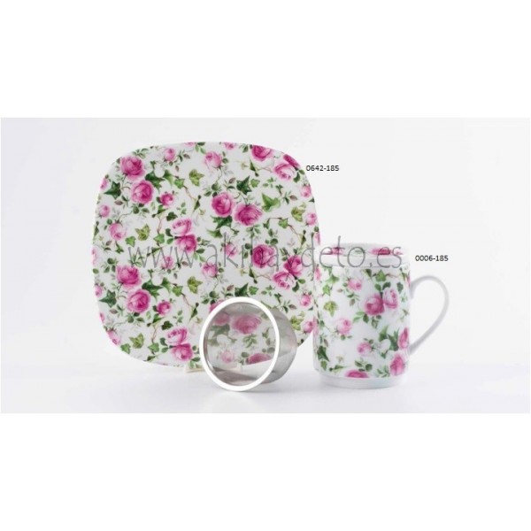 Juego de té individual. Bandeja cuadrada en porcelana tapizada modelo Ivy Rosal.