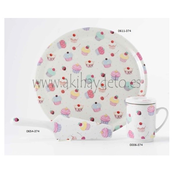 Set formado por Bandeja redonda lisa 31 cm y Espátula para tartas, en porcelana tapizada modelo Sweet Magdalenas.