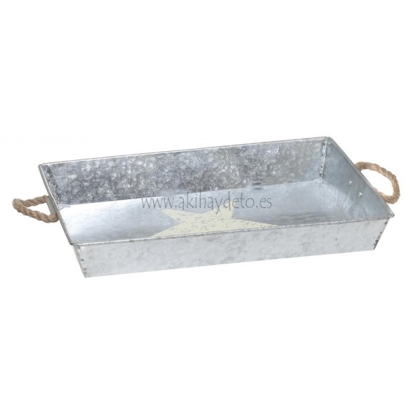 Bandeja en zinc rectangular de medidas 45x31x6 cm, con asas de cuerda pita.