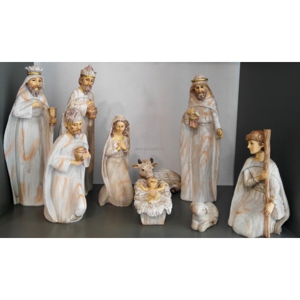 Pesebre de resina formado por 9 figuras de altura 27 cm: San José, María, el Niño Jesús, el buey, los tres Reyes Mayos, un pastorcito y la oveja.