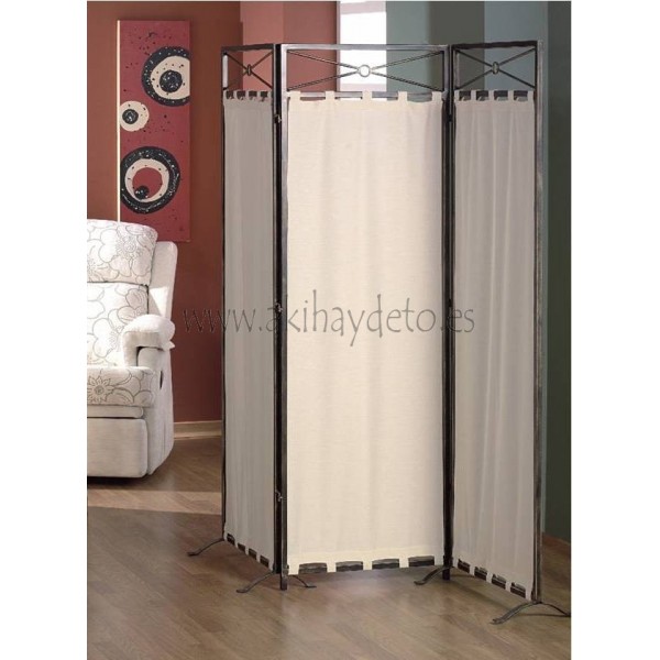 Biombo de forja color negro con tela de color blanco, de medidas 180 x 180 cm.
