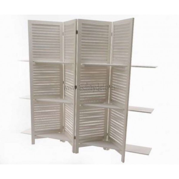 Biombo 4 hojas con 3 estantes, madera color blanco, medidas 167x160 cm.