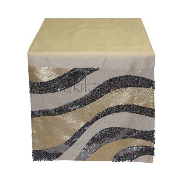 Conjunto de dos caminos de mesa en tono beige con estampado de rayas en dorado y negro y medida 40 x 180 cm.