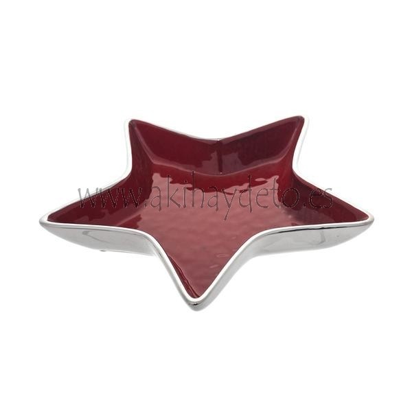 Centro decorativo con forma de estrella en cerámica color rojo y plata, medidas 25 x 25 x 4 cm.
