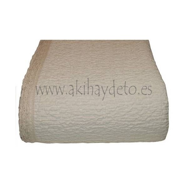 Colcha laura en color crudo con puntilla y medida 180 x 270 cm.