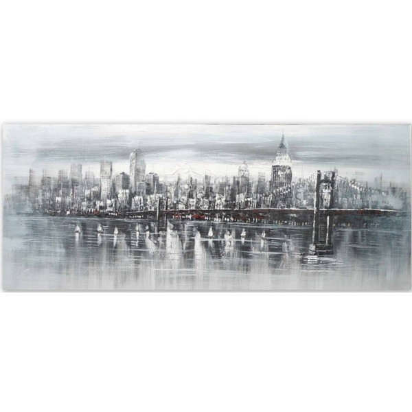 Cuadro puente en blanco y negro con edificios y el mar, bastidor cabecero pintura sobre tela. Medida 60 x 150 x 3.8 cm.