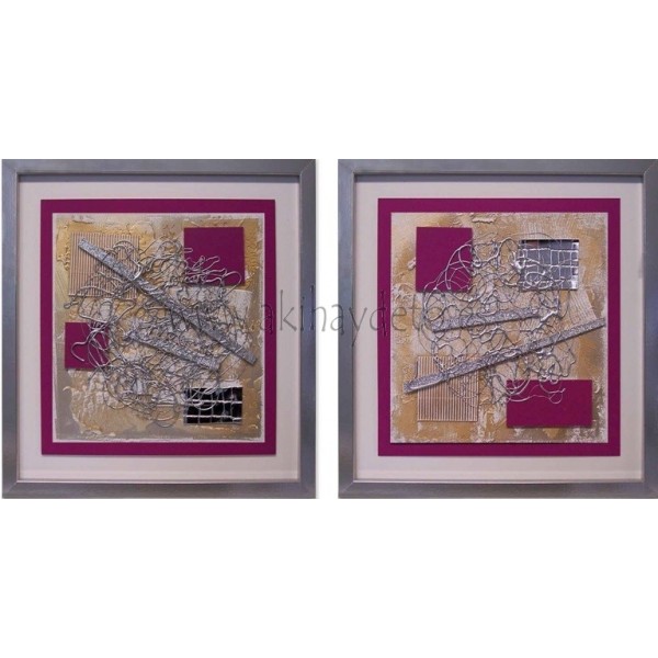 Set dos cuadros abstractos en tonos morados, marco en color plata brillo. Medida 40 x 40 cm.