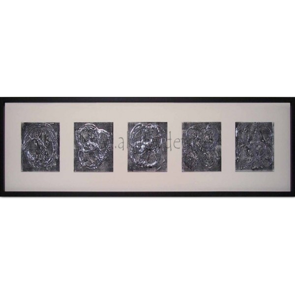 Cuadro abstracto de circulos en plata brillo, moldura negra. Medida 40 x 150 x 3.8 cm.