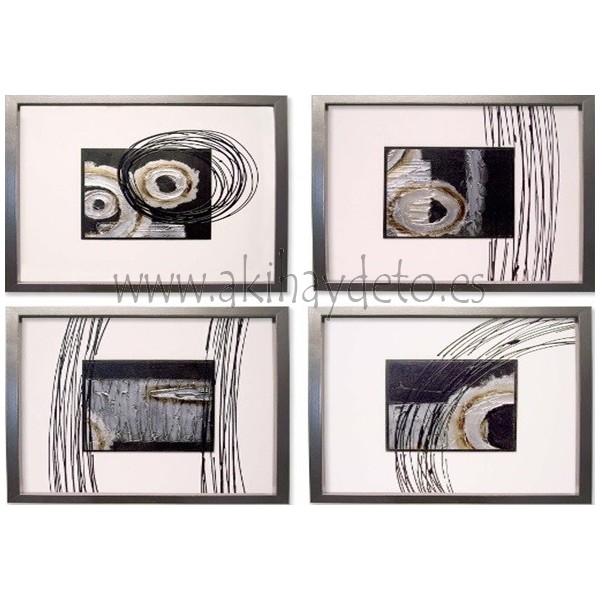 Set cuatro piezas abstractas, de circulos negro/plata y fondo blanco. Medida 43 x 43 cm.