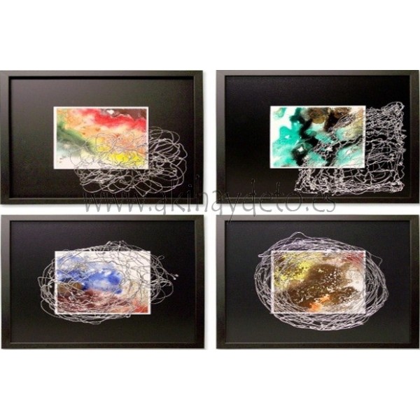 Set cuatro piezas de pintura agua de colores y fondo negro. Medida 43 x 43 cm.