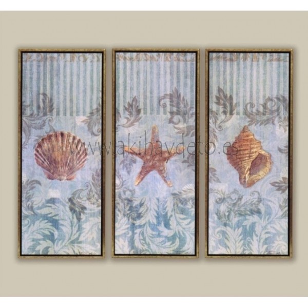 Cuadro estrella, concha de mar en tonos marrones y azules, precio en caja, Medida 22 x 52 cm.