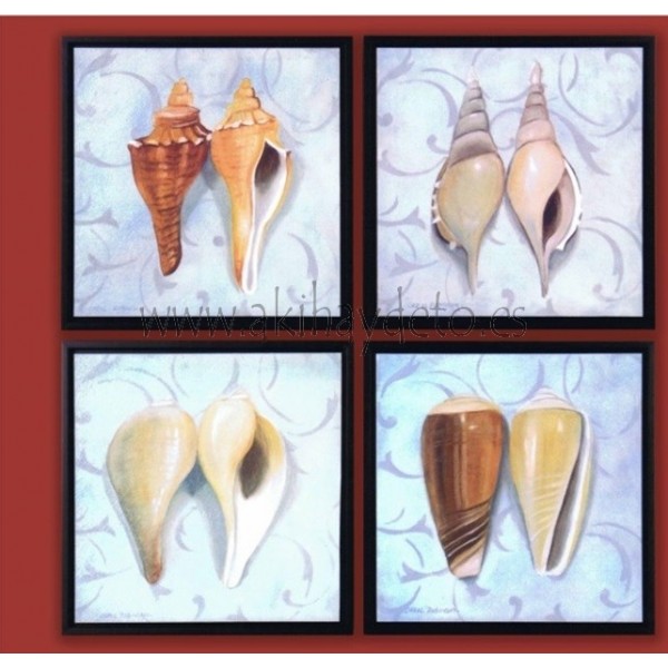 Cuadro conchas con fondo en tonos azules, precio en caja. Medida 24 x 24 cm.