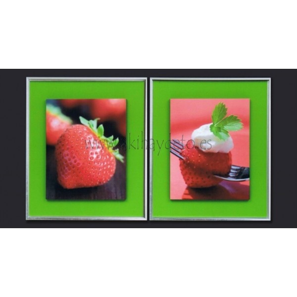 Cuadro fresas con marco en plata brillo, precio en caja. Medida 26 x 32 cm.