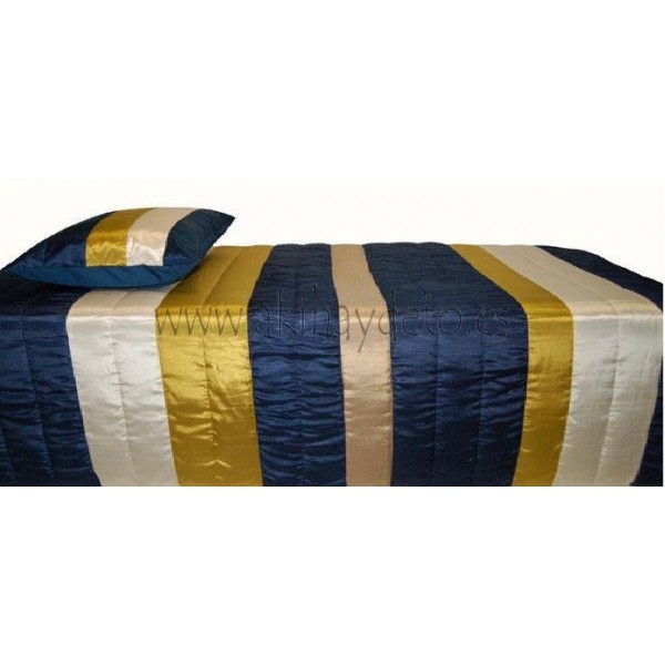 Edredon con dos almohadas de rayas beige, azul, amarillo y medida 250 x 260 cm.