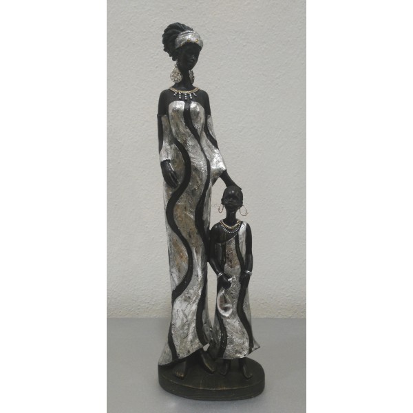 Figura decorativa, africana con niña color negro/plata, en poliresina de altura 35 cm.