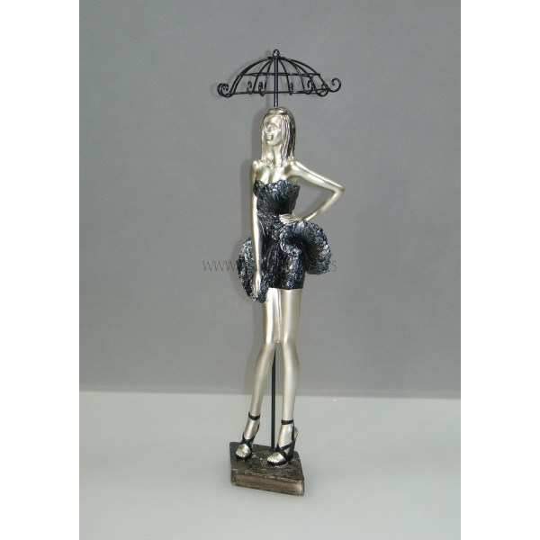 Figura decorativa en poliresina, mujer vestido negro/plata con paraguas, altura 43 cm.