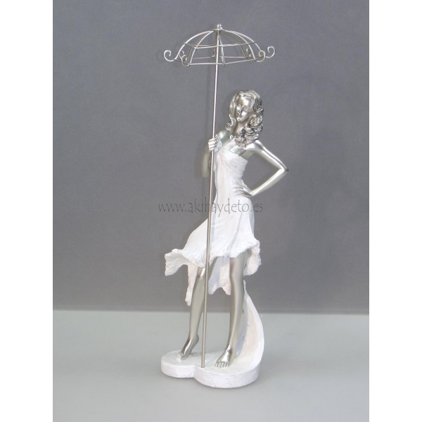 Figura decorativa en poliresina, mujer vestido blanco con paraguas, altura 44 cm.