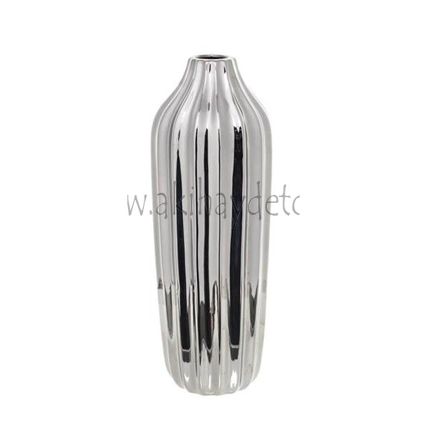 Jarrón florero decorativo en cerámica color plata, medidas 12x34 cm.