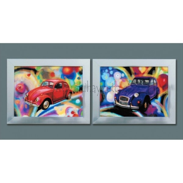 Cuadro coche en azul y rojo, marco de aluminio, precio por caja. Medida 32 x 43 cm.