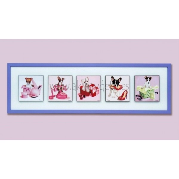Cuadro con cinco perros, precio en caja. Medida 16 x 16 cm.