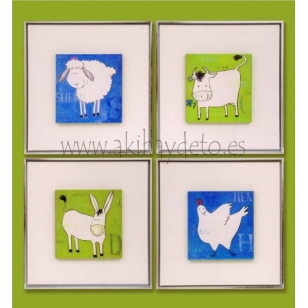 Cuadro con cuatro animales diferentes. Precio en cuadro. Medida 33 x 33 cm.