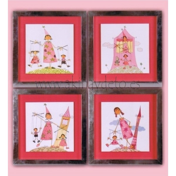Cuadro marionetas en color rojo, precio en cuadro. Medida 44 x 44 cm.