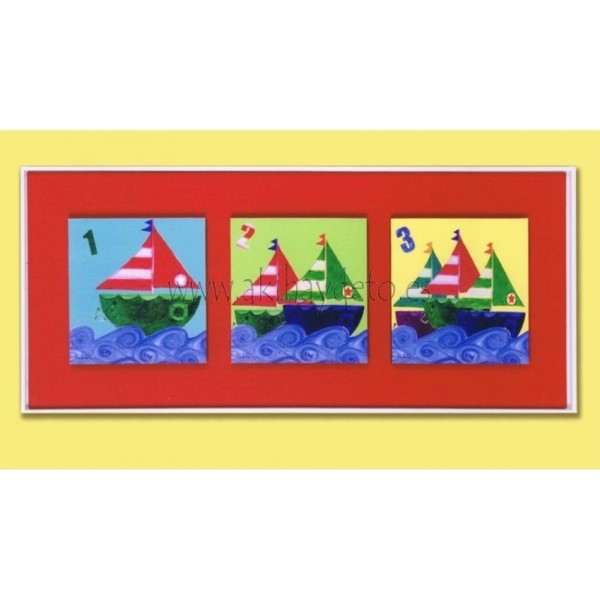 Cuadro barcos con fondo rojo, precio en cuadro. Medida 29 x 69 cm.
