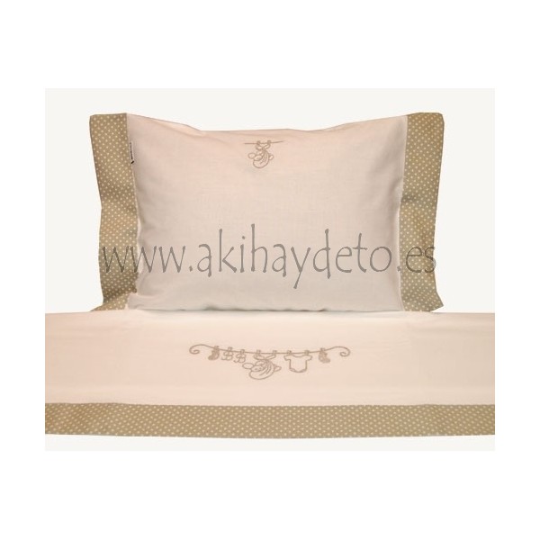 Juego de cama para bebé color barra beige con lunares blancos y bordados motivos bebé.