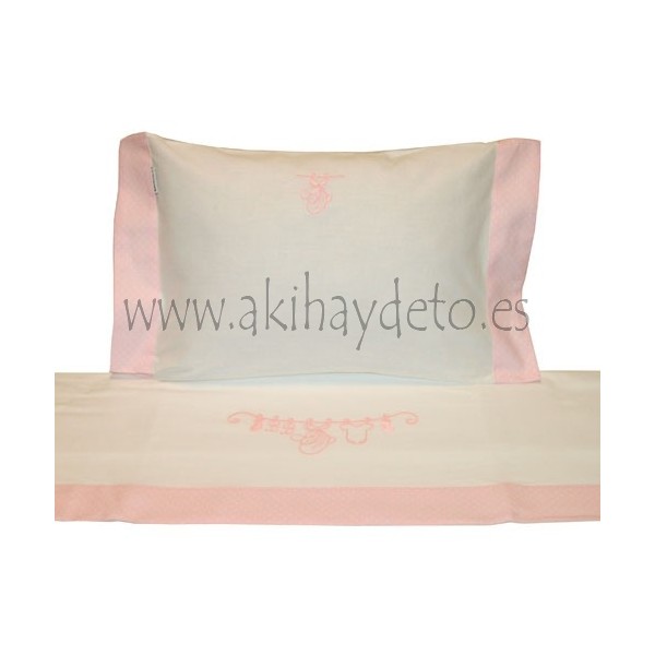 Juego de cama para bebé color barra rosa con lunares y bordados motivos bebé.