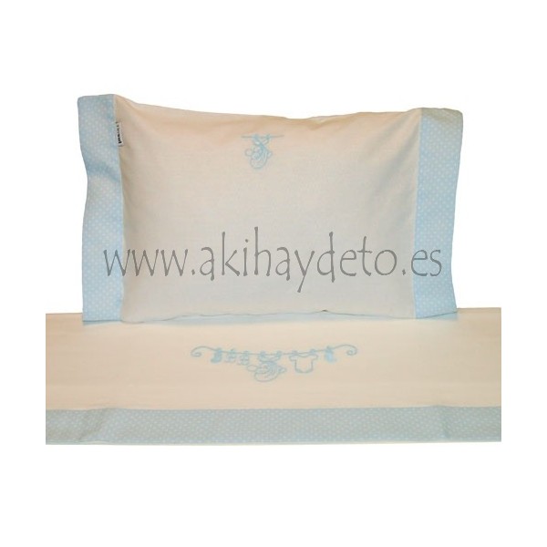 Juego de cama para bebé color barra azul con lunares y bordados motivos bebé.