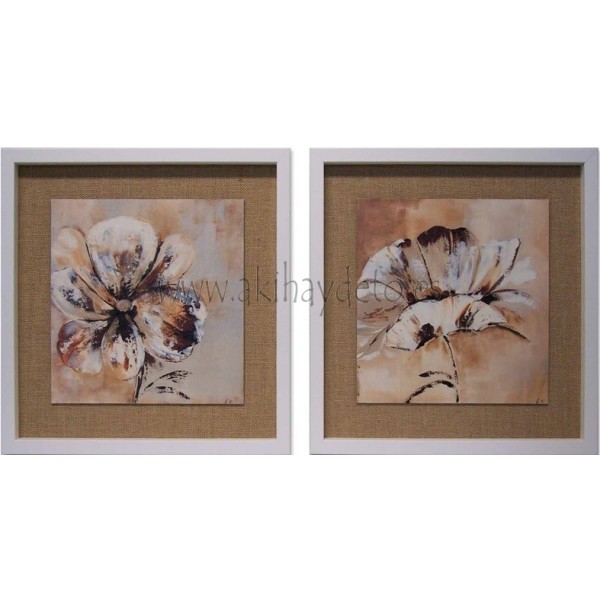 Set dos laminas de flores con marco en blanco mate y el fondo sobre tela de saco. Medida 43 x 43 cm.