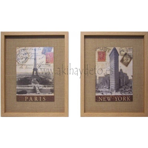 Set dos laminas paris y new york, marco color natural roble y el fondo sobre tela de saco. Medida 38 x 47 cm.