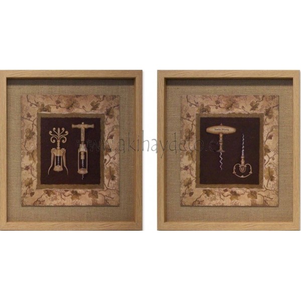 Set dos laminas sacacorchos, marco color natural roble y el fondo sobre tela de saco. Medida 43 x 43 cm.