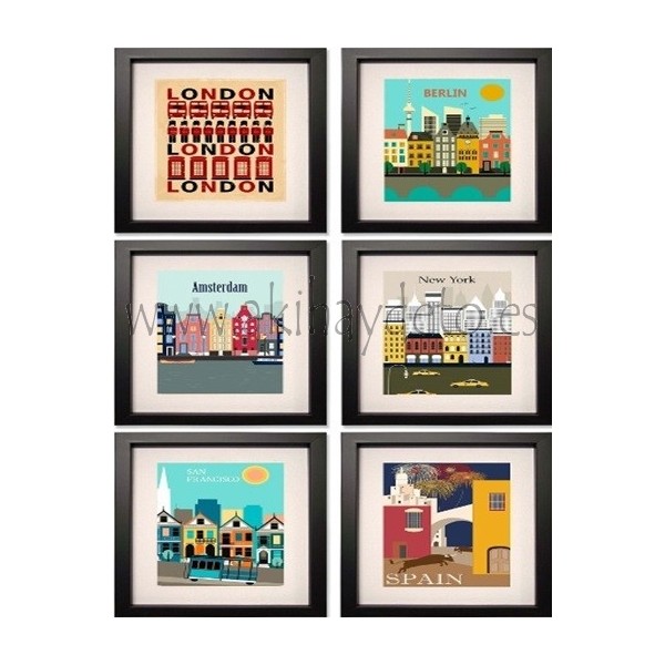 Set seis laminas de paises, marco negro. Medida 25 x 31 cm.