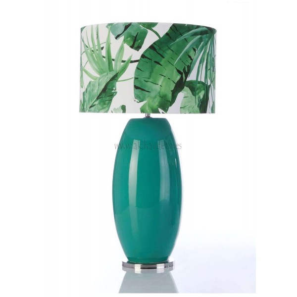 Lámparas de sobremesa con base en cerámica color verde agua y pantalla de hojas tropicales.