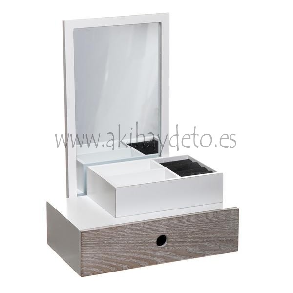 Caja joyero de madera con espejo y varios organizadores de joyas, uno de ellos para anillos. Medidas aproximadas 22 x 12,5 x 30 cm.