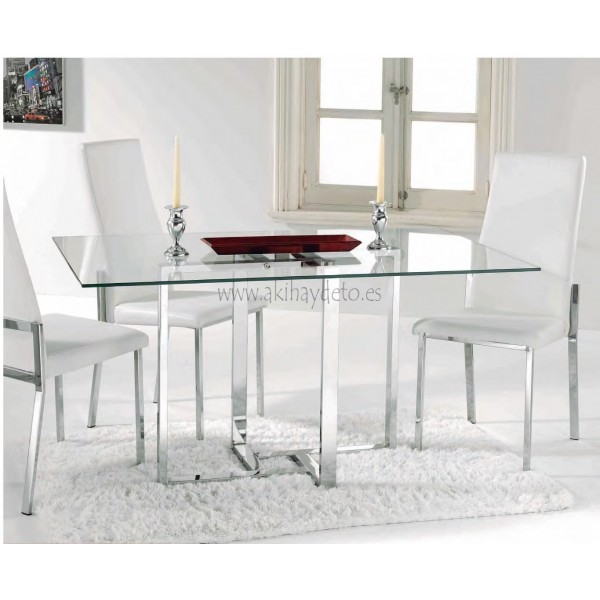 Mesa de comedor. Estructura metalica cromada. Cristal templado translucido. Topes regulables. Color transparente cromo. 140 x 90 cm.