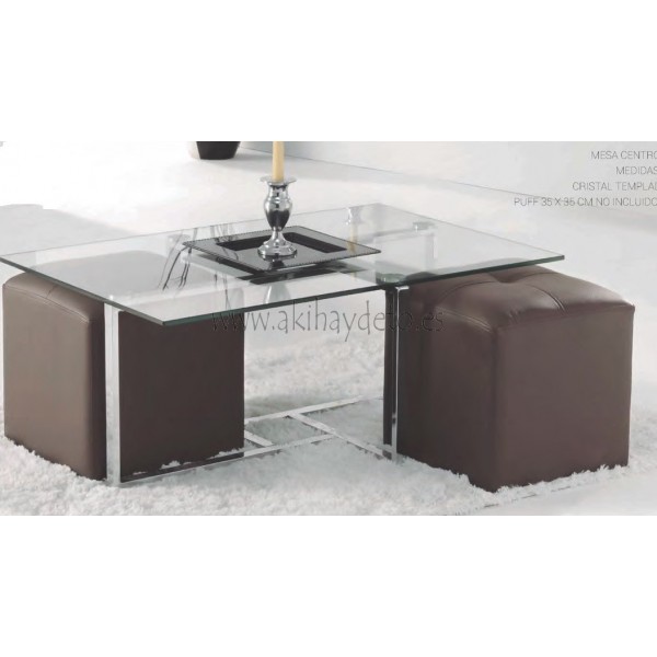 Mesa centro. 96 x 64 cm. Estructura cromada con topes regulables. Cristal templado translucido. Pufs tapizados opcionales medida 35 x 35 cm.
