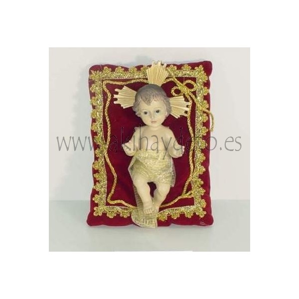 Figura de Niño Jesús en poliresina con cojín color rojo, disponible en varias medidas.