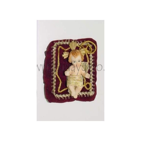 Figura de Niño Jesús en poliresina con cojín color rojo, medidas 10 cm.