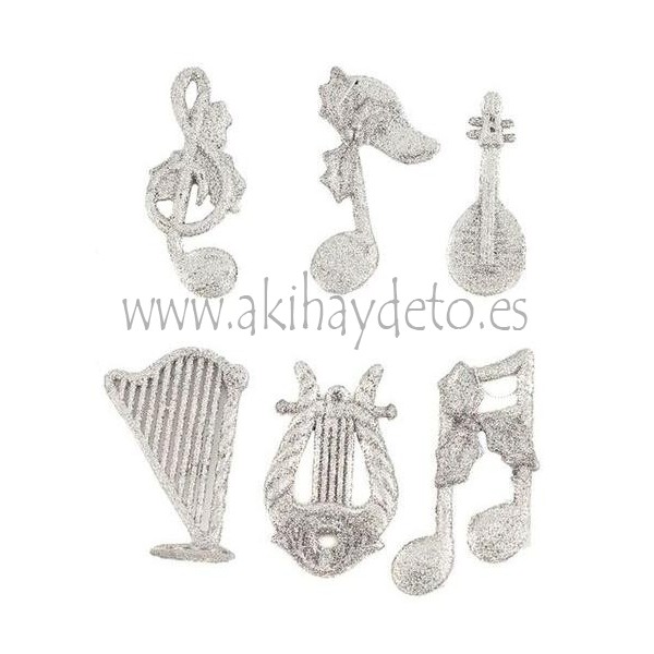 Set de 6 modelos de Notas e Instrumentos Musicales colgantes en color plateado, de 10 cm de altura, ideales para la decoración del árbol de Navidad.