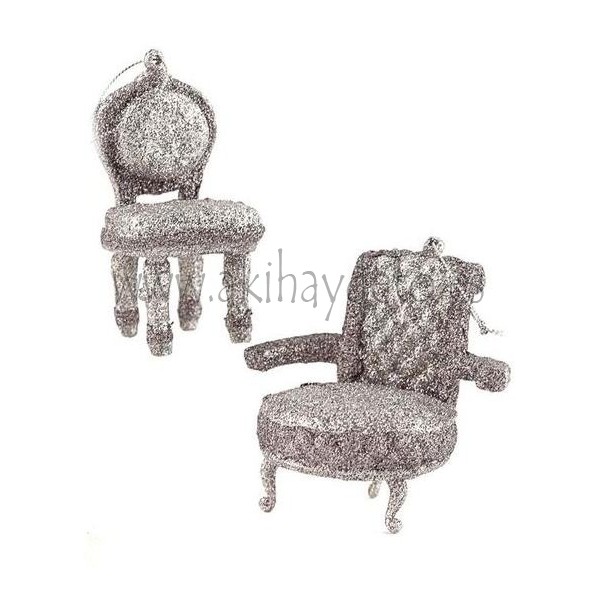 Decoración para el árbol de Navidad, set de 2 modelos de sillas colgantes en color plateado, de 9 cm de altura.