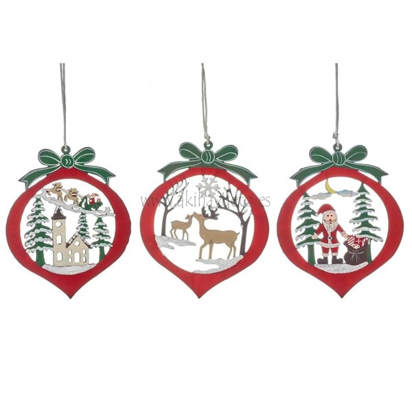 Set tres colgantes decorativos en madera, figura con adornos navideños, medidas 11x10 cm.