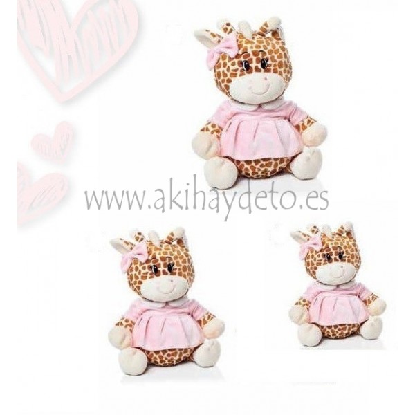 Peluche jirafa 0+ meses en color rosa, disponible en varias alturas, cumple con la normativa EN 71 CE, ideal para bebés o recién nacidos.